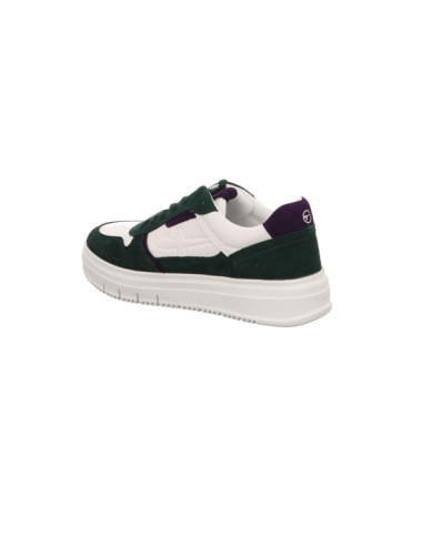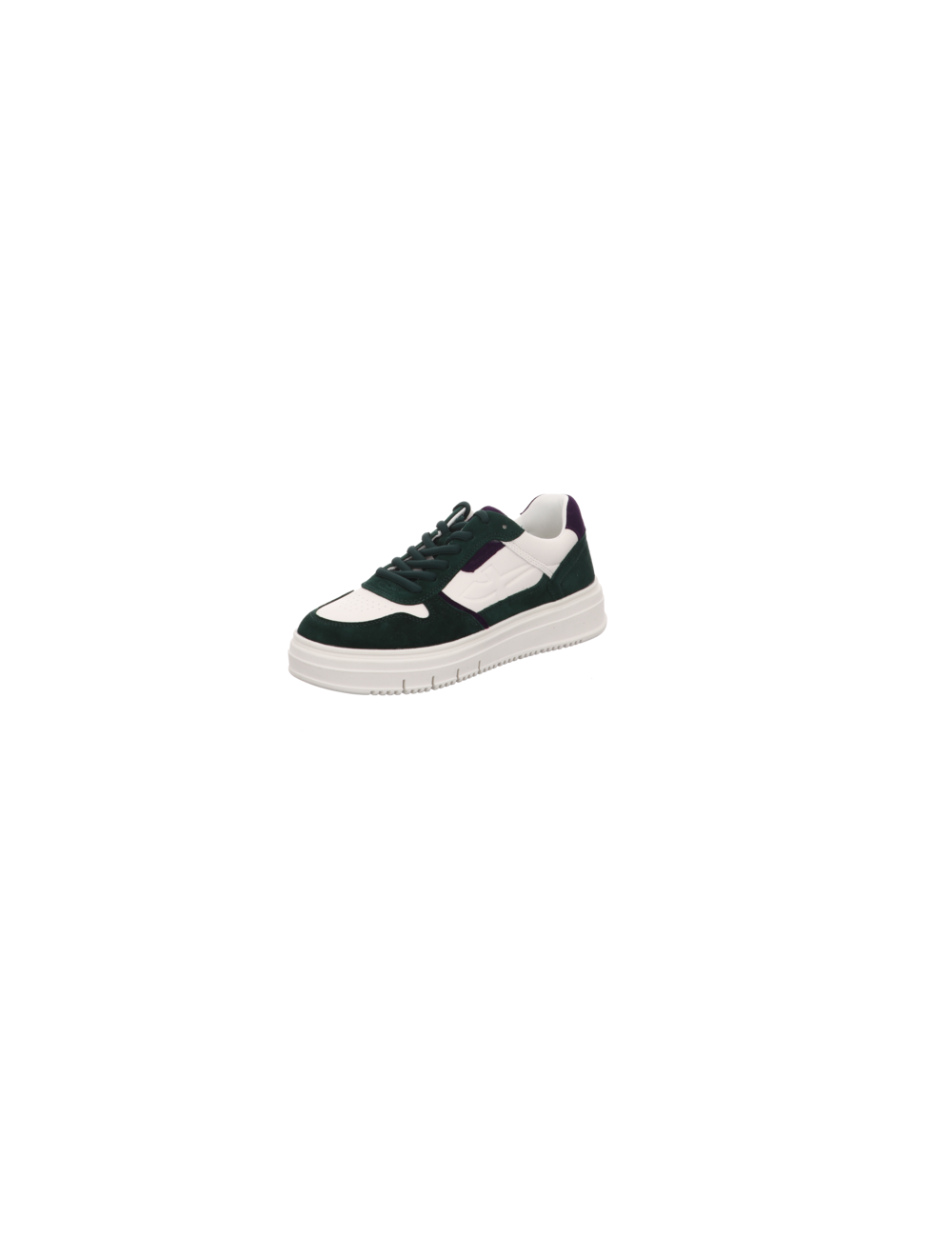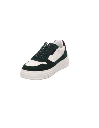 Sneaker in weißem Glattleder mit Details in grünem und lilanem Rauleder mit Gummisohle.